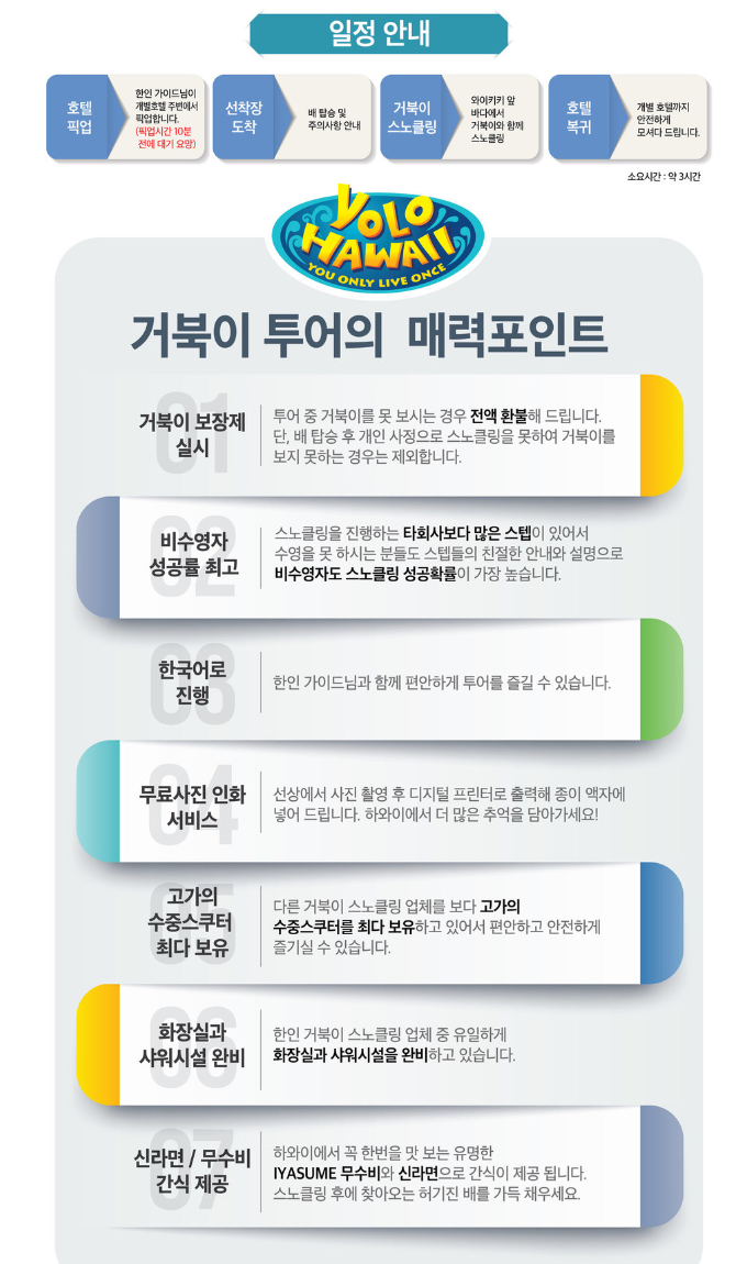 하와이 여행에서 JK투어 하와이 업체를 통해 즐겁게 스노쿨링을스노클링을 즐길 수 있었습니다. 하와이를 방문예정이시거나, 하와이에서 스노클링을 고민하시는 분들이라면 블로그 후기를 참고하셔서 좋은 선택 하시면 좋겠습니다.