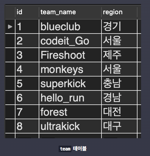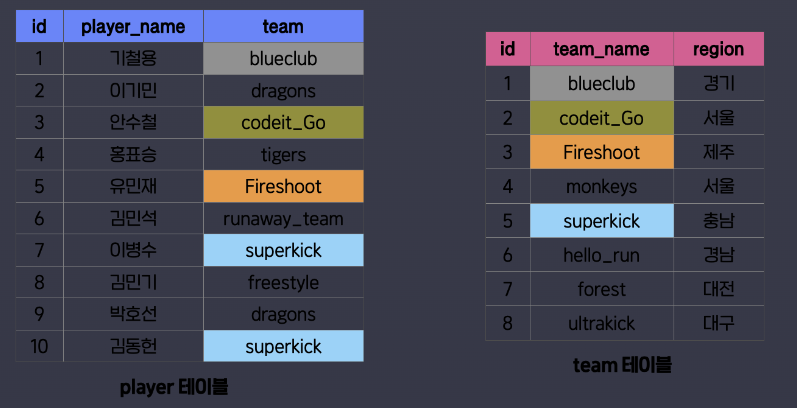 PLAYER 테이블과 TEAM 테이블이 있다.